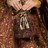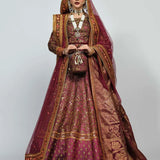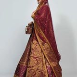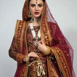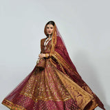 Drape yourself in the allure of timeless beauty with this stunning wedding ensemble. The wine-colored taffeta lehenga is a masterpiece, featuring golden resham and sequin embroidery jall that graces the fabric. A floral embroidery border adorns the bottom, accentuated by a rich velvet border on the lehenga. The set includes a matching taffeta embroidered pouch, completing the cohesive look. The wine taffeta choli is equally captivating with intricate golden resham and sequence embroidery, showcasing a neckline patch embellished with zardozi work. The ensemble is elegantly finished with delicate gotta and tassels. Paired with a jacquard dupatta featuring a velvet embroidered border and a net dupatta with embroidered small boti and velvet-embroidered border, this outfit embodies sophistication and charm, making it a perfect choice for a bride looking to shine on her special day.