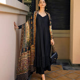Exuding sheer grace, Shelina is a true statement piece. Cut from opulent silk, the black kalidar features lavish resham embroidery work, complemented perfectly by the voluminous silhouette of the ensemble, further accentuated by the embroidered silk culottes. This set also includes a delicately embroidered printed silk dupatta, lending the ensemble a captivating allure, ensuring you stand out each time.