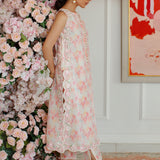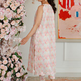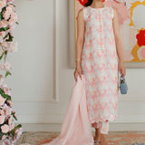 Cut from pure raw silk. The Ikat Emma set is inspired by abstract watercolours in shades of soft peach, pink and aqua. The Ikat print is adorned with a richly embroidered neckline and sleeves, with delightfully dreamy pearl accents. Richly embroidered blooms adorn the armholes, the daaman and side slits. The delicate embroidered edges are cut in romantic scallops to add an extra bit of oomph to your outfit. The pure medium silk dupatta in a soft pink hue has organza pallus with sequin floral motifs.