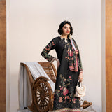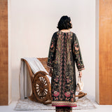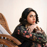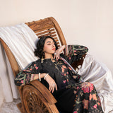 A gorgeous work of art, this black with bold hues printed silk set is a must have and comes with a complimentary scarf to add that bit of sophistication.