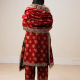 This Majestic red matching shirt , shalwar and shawl is block printed with delicate floral bunches all over . The sequined border addes splendid look to the whole outfit making it look extremely appealing. This outfit is perfect for festive and wedding season.
