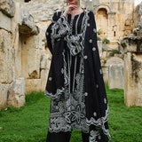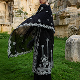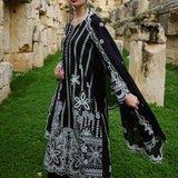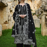 Jana in Black from our Lawnkari '25 Collection. A cutwork embroidered cotton lawn 3-piece outfit paired with dyed voile embroidered dupatta. €‹