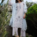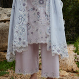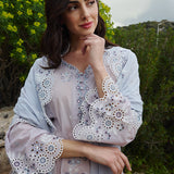Lyra in Lilac/Blue from our Lawnkari '25 Collection. A cutwork embroidered cotton lawn 3-piece outfit paired with dyed voile embroidered dupatta. €‹