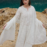 Nour in White from our Lawnkari '25 Collection. A cutwork embroidered cotton lawn 3-piece outfit paired with dyed voile embroidered dupatta. €‹