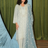 The Light Blue/Blue Cotton Embroidered 3-Piece Suit from our Spring The Tea '25 Collection features a straight souette, V neckline embellished with lace, full length embroidered sleeves, paired with embroidered izaar & dupatta.€‹