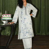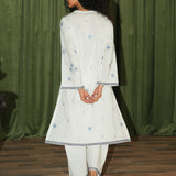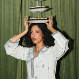 The White Cotton Embroidered Co-ord Set from our Spring The Tea '25 Collection features a straight silhouette, V neckline, full length embroidered sleeves, paired with culottes.€‹