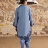 The Periwinkle Blue Cotton Satin Embroidered Co-ord Set from Spring Staples '25 Collection features a knee-length shirt, V neckline, and full-length embroidered sleeves paired with an embroidered shalwar.€‹