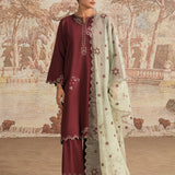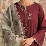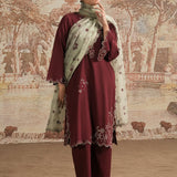 The Wine/Olive Green Cotton Satin Embroidered 3pc Suit from Spring Pret '25 Collection. A straight silhouette, round neckline with a slit, full length embroidered sleeves paired with embroidered izaars and soft organza dupatta.