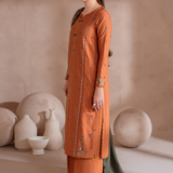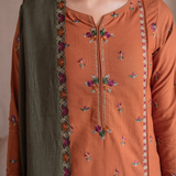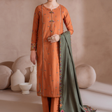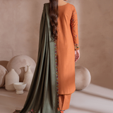 Shirt Center Panel: Embroidered KhaddarShirt Side Panels R+L: Embroidered KhaddarShirt Back: Dyed KhaddarSleeves: Embroidered KhaddarSleeves Lace: Embroidered OrganzaShawl: Embroidered Woven Shawl (2.5 M)Shawl Lace: Embroidered Organza (5 M)Trouser: Dyed Khaddar