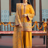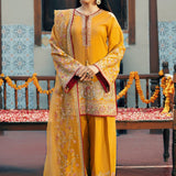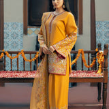 Step into sophistication with this exquisite mustard yellow ensemble. The Russian raw silk short shirt, adorned with intricate embroidery, glistening pearls, and crystals, adds a touch of luxe refinement. Delicate tassel detailing graces the neckline, while the PK raw silk embroidered shalwar pants bring a blend of traditional charm and contemporary elegance. Paired with a lightweight organza dupatta, this outfit is a flawless choice for festive gatherings, blending opulence with a timeless silhouette.