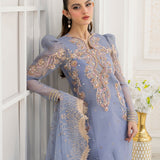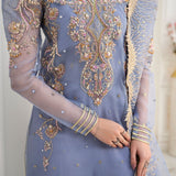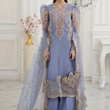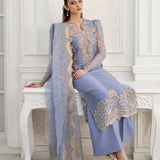 Lavender Blue embroidered organza straight shirt with hand embellishment crystals and pearls with scalloped embroidered dupatta paired with pk raw silk lose bottom pants