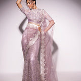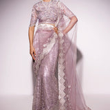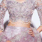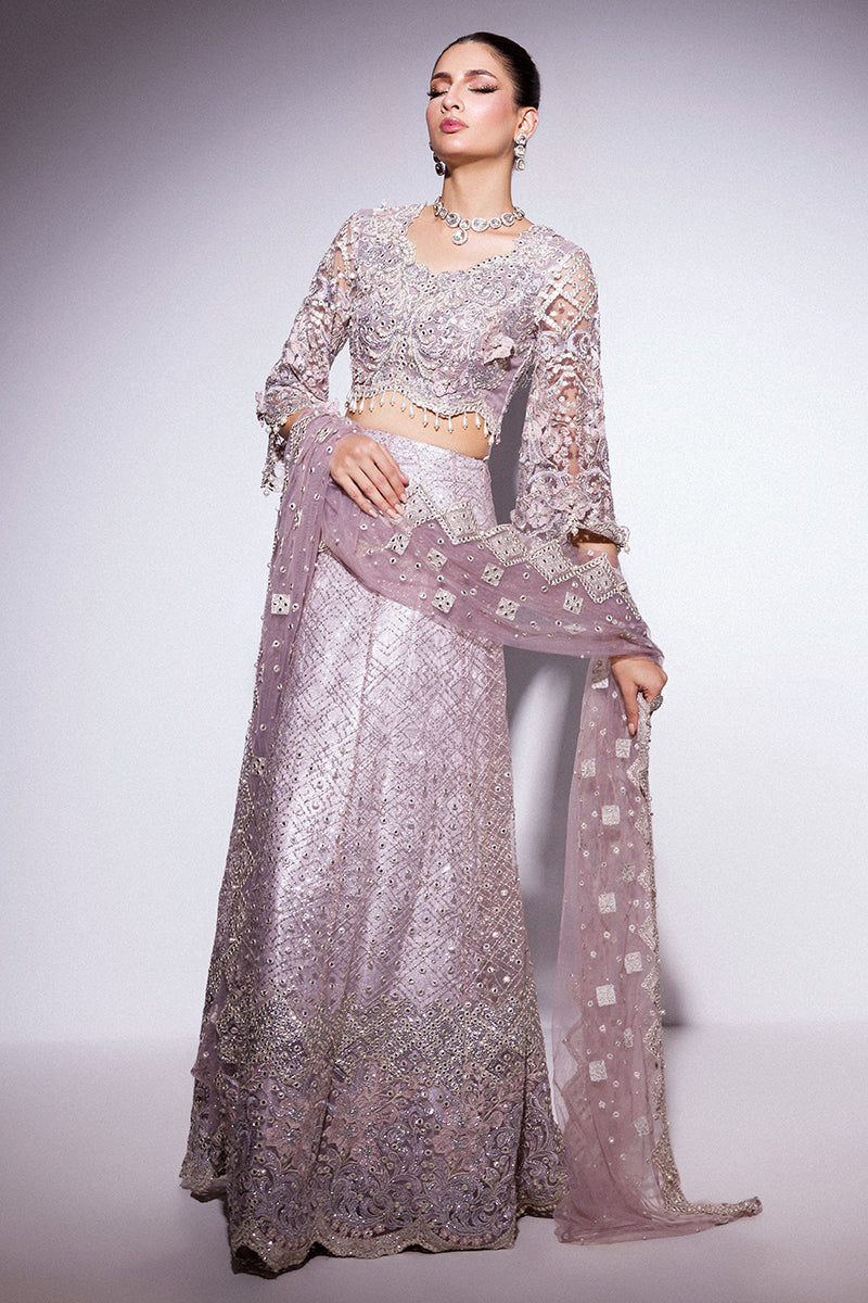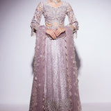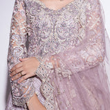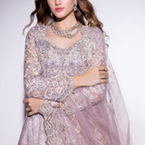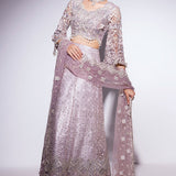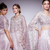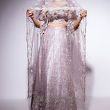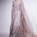 A heavily embroidered and hand embellished shirt comes with a silver jamawar lehnga and a matching net dupatta with pearl finishing.