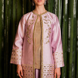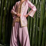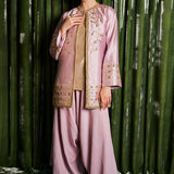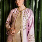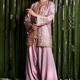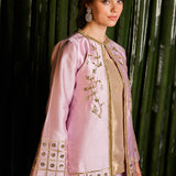 A delicate charm unfolds with "Sanjh" - a raw silk ensemble adorned with intricate gota details, perfect for timeless elegance.