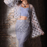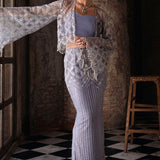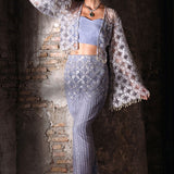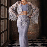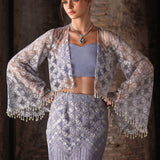 At the heart of Lyra is a stunning net jacket, delicately crafted to drape you in sheer beauty and grace. Its ethereal allure is enhanced by intricate Resham embroideries, meticulously woven to adorn every inch with exquisite detail. Complementing the jacket is a raw silk and net mermaid skirt, designed to accentuate your silhouette with its flattering fit and flowing elegance.