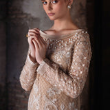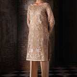 "Vixen" in Sand, a striking ensemble that radiates elegance and charm. At the forefront of Vixen is a captivating embroidered pure organza shirt, adorned with delicate pearls embellishments along the neckline, adding a touch of sophistication to the piece. The shirt is adorned with intricate Resham embroideries all over, creating a mesmerizing tapestry of timeless beauty. Pairing seamlessly with the shirt are raw silk trousers featuring embroidered pattis, adding a subtle yet elegant detail to the ensemble.