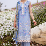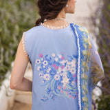 Myosotis, in captivating blue features chikan embroidered lawn front and digital print pure chiffon dupatta. The look is further accentuated with crochet lace detailing on the front and back and embellished tassels on the neckline, thus making this ensemble a perfect choice for those seeking timeless beauty and refined style.