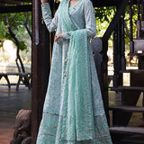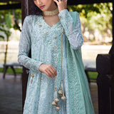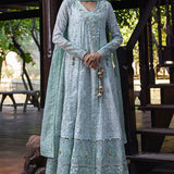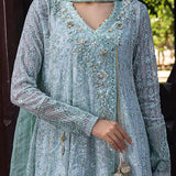 Step into luxury with this stunning outfit, featuring hand-embellished embroidery and sequins on both the front and back necklines, sleeves, and side panels. The ensemble includes a cotton silk undershirt, raw silk trousers, and a beautifully adorned dupatta with embroidered organza lace, finished with exclusive handmade tassels and intricate mirror and golden samosa lace for a truly opulent look.