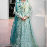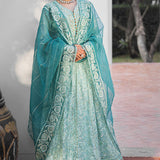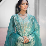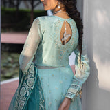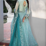 Indulge in elegance with this lavish outfit, showcasing hand-embellished embroidery and sequins across the front and back necklines, sleeves, and kali. The design is completed with, raw silk trousers, and a dupatta adorned with embroidered organza lace and golden finishing touches for a sophisticated and dazzling look.