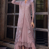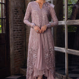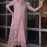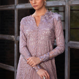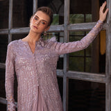 Ember in Lilac is the epitome of refined luxury, perfect for making a statement at any special occasion or event. The focal point of Ember is its raw silk and organza open shirt, a masterpiece of craftsmanship and elegance. Adorned with a myriad of intricate details, including Resham embroideries, hand-embellished Swarovski crystals, sequins, stones, pearls, 3D flowers, and luxurious fur, this shirt is a testament to opulence and sophistication. Complementing the shirt is a three-layered chiffon skirt, adding a touch of fluidity and grace to the ensemble.