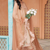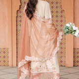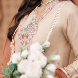 Indulge in the enchanting allure of "Enchanted Elegance" and experience the timeless beauty of a peach-hued dream. With its delicate pearls, sparkling crystals, Swarovski elements, and intricate Dabka embroidery, this exquisite ensemble is a celebration of grace, sophistication, and the enchanting allure of timeless elegance.