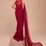 Bold printed velvet with delicate sequinned blouse with organza sari having running florals made with Swarovskis.