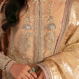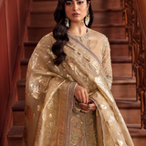 A Golden Symphony of Style! Lumene RTW unveils an unmatched vision in the form of a resplendent golden organza shirt with an open cut, gracefully paired with a regal raw silk sharara adorned with abstruse patterns. A celestial touch is added by the screen-printed dupatta featuring delicate lilac cut-work borders, elevating your fashion quotient to celestial peaks.