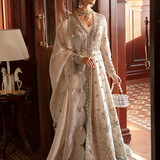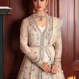 A vision of elegance and poise, the dress dazzles with its dreamy white organza peshwas shirt infused with hints of misty blue, like a fleeting reverie. Enveloping the wearer in grace, the ensemble is harmoniously completed with a same-toned raw silk shrara, draping gracefully like a flowing cascade of clouds. As a finishing touch, an organza dupatta, gracefully cascading with embroidered patched borders, bestows an air of poetic grace.