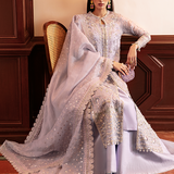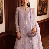 Presenting an ensemble with a captivating manifestation of stylish finesse. The peri-wrinkle hue of the organza shirt blooms like a rare flower beautified with irresistible dreamy green patches that lend a tantalizing aura to the overall design. Complementing this ethereal top is a beguiling raw silk sharara, gracefully draping the silhouette with its flowing magic. Finishing the ensemble is the diaphanous organza dupatta, delicately veiling the wearer with a touch of mystery and allure. Lenore, cast a magnificent spell upon all who lay eyes on this lovely attire.
