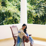 A beige white A-line cotton shirt featuring a crew neckline. It is adorned with tie-dye fabric tassels and has self-embroidery with hints of blue and green. The shirt showcases a layered boring technique that enhances its overall appeal. It has a scalloped hem with lace detailing and raglan sleeves that also feature lace accents.