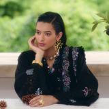 Black jacquard, a-line front open kurta with right-angle, wide sleeves, with chiffli self embroidery. The kurta is further enhanced by embroidery of a vartiaing pastel palette in florals at the border, the edges and along the center and sleeves. It features a rectangle v-neckline with printed raw silk and lace detail. There spiral geometric embroidery on the sleeves which finesse the look.