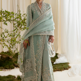 - GREY GREEN WRAP-AROUND ANGHRAKHA WITH EMBROIDERY AND TASSEL DETAILS.