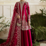 - BERRY RED RAW SILK PEPLUM WITH EMBROIDERY AND NECKLINE DETAILS.