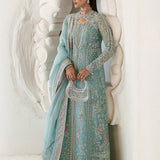 - Ice blue front open pishwas, with embellishments and embroidery with stone work and rubies and keyhole neckline and raglan fitted sleeves. Stitching details in between the panels and on the sleeves which also have further patchwork.