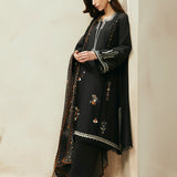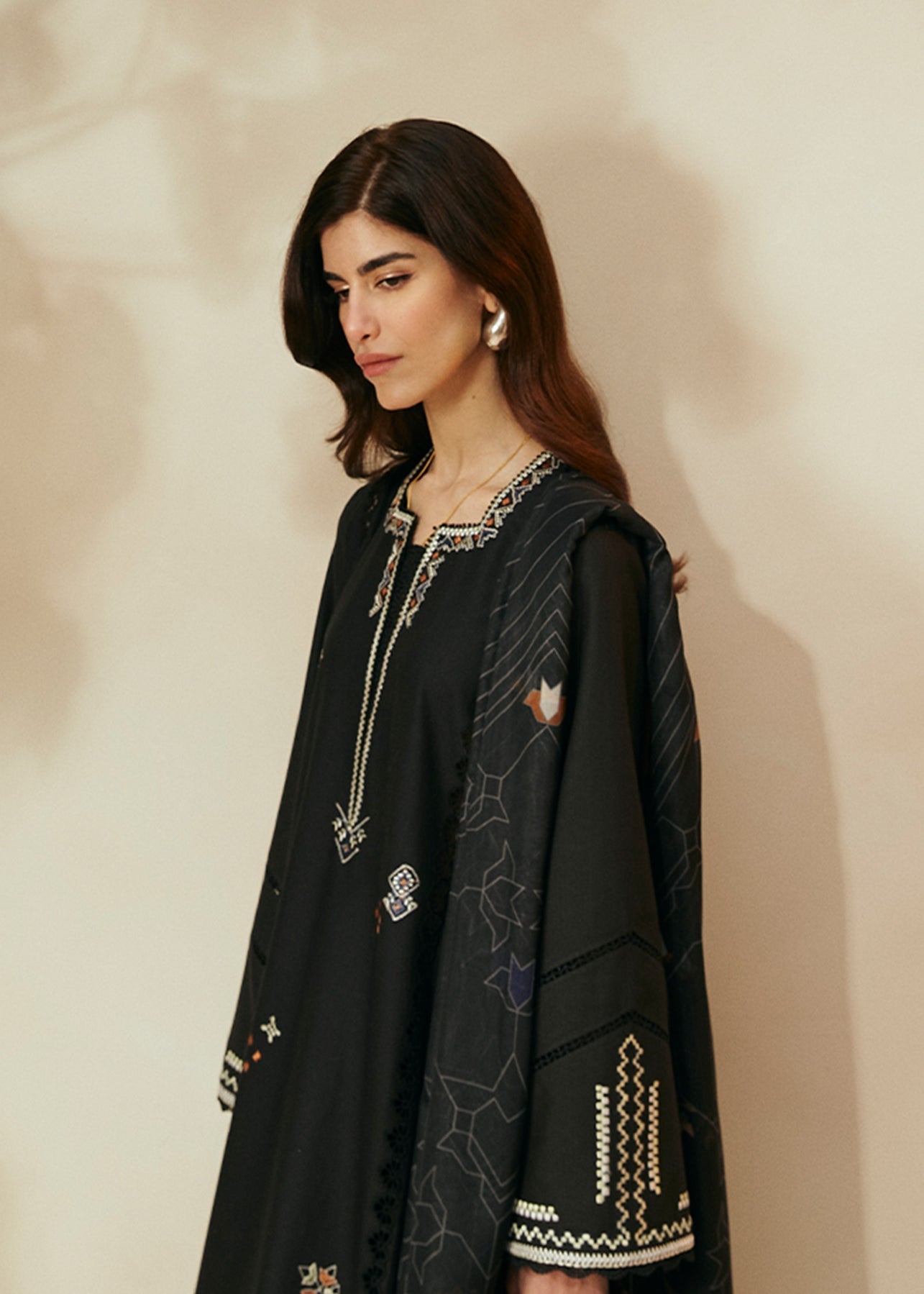 - Black colour textured lawn with a drop corner silhouette. Straight shirt with embroidery and fine details. Square neck with elongated V, styled with lace.