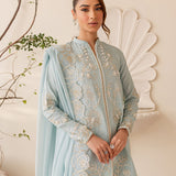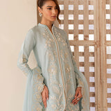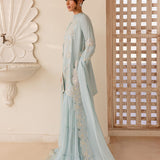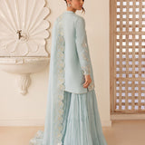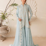 An elegant ice blue outfit featuring embroidered open silk shirt with delicate embellishments, paired with a flowing sharara and a embroidered chiffon dupatta