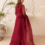 A deep maroon embroidered front open gown with embellished front and sleeves, paired with raw silk maxi and organza dupatta
