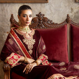 This bold maroon ensemble, crafted from sumptuous velvet, radiates regal elegance. The neckline features exquisite golden embroidery with subtle hints of red, adding depth and richness to the design, sleeves and hem are delicately embellished with matching golden threadwork along the red spray, Completing the look with a maroon organza dupatta, scattered with shimmering golden motifs, with elegant red and golden borders, adding a touch of finesse. This striking ensemble is perfect for those seeking a bold, statement look, ideal for weddings, festive celebrations, or formal gatherings.