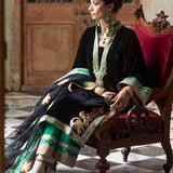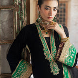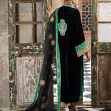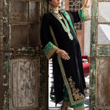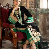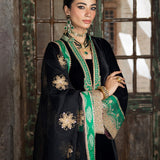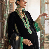 This elegant deep black ensemble is crafted from luxurious velvet, exuding sophistication and grace. The neckline is a classic subtly embellished with delicate green embroidery that flows gracefully down the yoke, adding a soft contrast to the dark fabric. The full-length sleeves are adorned with intricate green threadwork along the cuffs, creating a harmonious balance between simplicity and grandeur. Paired with a striking black organza dupatta, delicately draped with shimmering golden motifs scattered across its sheer canvas, lending an ethereal charm. The fusion a perfect blend of elegance and luxury.