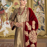 A regal golden ensemble crafted from luxurious brocade fabric, radiating elegance through its intricate embroidery...