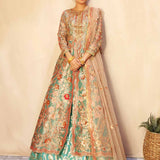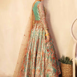 It is a 3 piece stitched outfit including shirt, lehenga and dupatta. It is in mint green shade It's a frock with front slit, paired with a lehenga as a lower. Fabric for frock is pure katan organza, fully hand embellished from front, back and sleeves. Badla fabric is used for lower with Dupatta is a in net fabric with embellished border patched on 2 side sides.