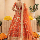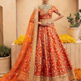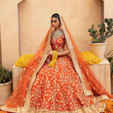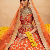 "AABROO'' Embellished with floral pattern in fine golden cord of tilla and sequins. Neckline is hand embellished with sequins, pearls, naqshi, dabka and Crystals. The lehanga has multiple pannels with the division of gotta patti. The look completes with same color Dupatta which has four side border.