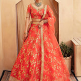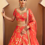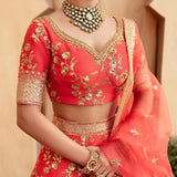 "Aarohi" A perfect festive occasion outfit which neckline is adorned with crystals, sequins, pearls, and zardozi work. It is paired with a same floral tilla & sequins embroidered lehanga featuring a décolleté neckline, along with an embroidered chatta net dupatta with four side border.