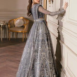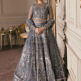 The breathtaking grey formal "Florentina" consists of hand a richly embellished tulle bodice and volume panels with a rich border tulle dupatta featuring zardozi, crystals, sequin and resham work. Paired with waist Belt.
