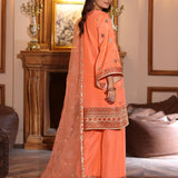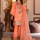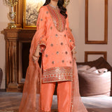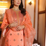 In this striking ensemble of "Blush" the pick of peach is simply sublime the Raw silk shirt and trouser are made more appealing by this particular hue, creating a truly captivating look. The piece is embellished with gold sequins, nakshi and pearls on the neckline and sequence embroidery on front, back, sleeves and borders. The organza dupatta with four sided borders edges adds a touch of glamour and flair to chic ensemble.