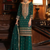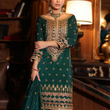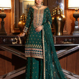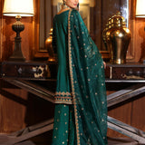 Indulge in the mystique of elegance with "Daylilly" by "Mah-e-nur". This Emerald Green ensemble, kissed by the Allure of Gold zari and Sequin embroidery on the beautiful round neckline style shirt is testament to Artistry. The heavy embellished shirt create an aura of charm. Embroidery grace while the intricately adorned sleeves complete the ensemble with a same color embroidered trouser and organza dupatta of four side border along with centre booti sapry the design embodies the essence of a mystic orchid.