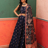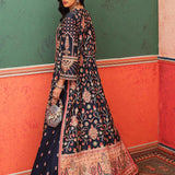 Carefully crafted Mughal architecture, flora and fauna takes centre stage on our richly blue embroidered Borgia coat. It comes with a slip and lehnga.