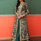 Mumtaz Mahal is vivacious, zesty and vibrant. A Bluish Green Gown with a heavy ghair border makes up this royal ensemble. The accents of fuchsia in the finishing adds a whimsical touch of modernity and playfulness to this timeless attire. The look is complete with a Raw Slik febric lehenga.