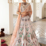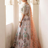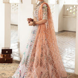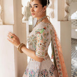 "Gul Bano" Lehnga has pure white sequins embellished fabric with Flowers, birds and peacock resham motifs. It is paired with white heavily handwork choli with embellishments on neckline, front, back and birds motifs on elbow sleeves which has crystals,sequins and zardozi with back handmade tassels. The exquisite craftsmanship requires laborious hours. It has a peach organza dupatta highlighted with center jaal which further has four sided border