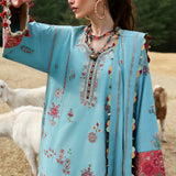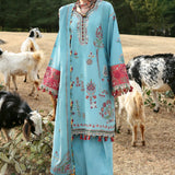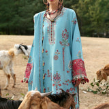 Rhea - Drenched in a mesmerizing ocean blue, this tribal-boho masterpiece is a celebration of artisanal heritage with a contemporary edge. Intricate embroidered motifs in crimson, sage, and brick sprawl across the fabric, creating a rich tapestry of tradition. The bold crimson embroidered patti on the sleeves adds a fiery accent, while delicate laser appliqué work elevates the design with a touch of modern craftsmanship. The tonal voile dupatta, adorned with intricate embroidered motifs, flows effortlessly, perfectly complementing the statement printed trousers. A meticulously embroidered back motif completes the ensemble, making it the ultimate choice for the free-spirited woman who embodies culture, confidence, and effortless elegance.
