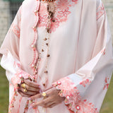 Zania – Drenched in a dreamy sweet pink hue, this exquisite ensemble is a poetic celebration of floral artistry. Delicate Schiffli florals bloom across the shirt, harmonizing with embroidered wildflowers in tonal shades, while intricate laser-cut detailing adds a touch of contemporary finesse. The beautifully embroidered neckline lends a refined charm, complemented by a tonal voile dupatta adorned with a cross-stitch border and floral motifs on the pallus. Paired with tonal trousers featuring subtle cross-stitch accents, Solène-B embodies soft femininity, seamlessly blending tradition with modern elegance.
